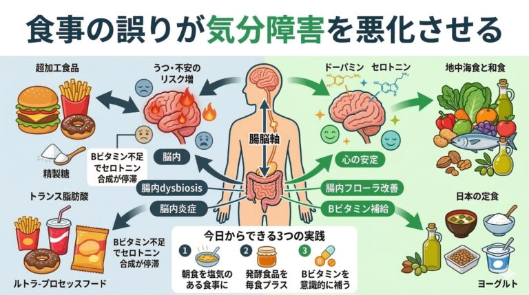 超加工食品や精製糖を日常的に摂取すると、有益な腸内細菌が減少し、腸内フローラのバランスが崩れます(腸内dysbiosis)。その結果、腸管の炎症が起きてリーキーガット(腸管透過性の亢進)が生じ、炎症性サイトカインが血液脳関門を越えて脳内炎症を引き起こします。この「腸脳軸(gut-brain axis)」の機能不全が、うつ・不安・意欲低下・慢性疲労として表れるのです。