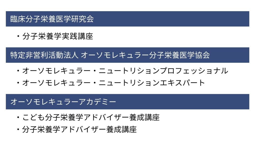 記事執筆時点の2026年1月時点で、代表的な分子栄養学講座を開講しているのは、以下の3団体です。
