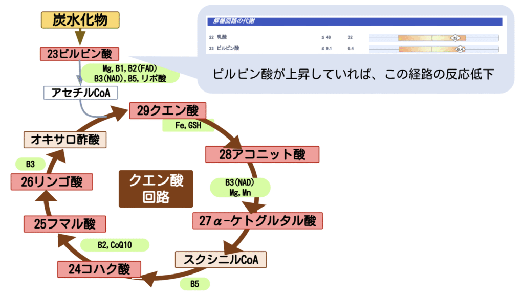 だから有機酸検査でピルビン酸が多くてクエン酸が少なければ、ピルビン酸をアセチルCoAに転換する経路の働きが悪いんだろう、と推測できます。ピルビン酸デヒドロゲナーゼという酵素の働きが悪いのか、もしくは補酵素ビタミンB1などが足りないのかなどと推測できます。